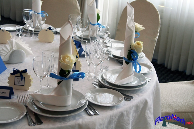 Обычно одна-две веточки цветов переплетаются лентой вместе с салфеткой. Также небольшие цветочные венки могут украшать столовые приборы или бокалы. Мелочь, казалось бы, но такие мелочи и создают праздник. Для такого декора используют не только свежие, но и засушенные цветы.