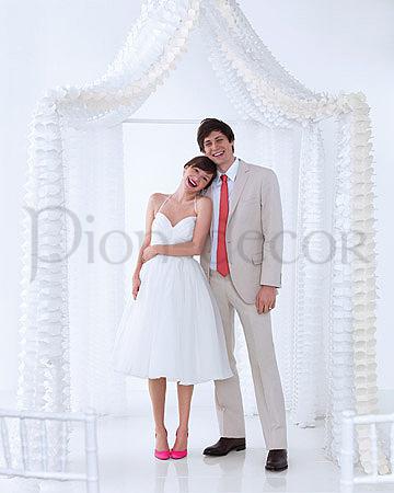 Конечно, нужно продумать образ жениха и невесты. Прелесть ромашковой свадьбе в ее простоте, поэтому девушке совсем не нужно дорогое пышное платье. Будет отлично смотреться белое платье с ромашковым принтом в сочетании с простыми балетками или даже кедами. Невестам, которые хотят надеть более изысканный наряд, стоит выбрать свободное платье без корсета, либо платье в деревенском стиле.